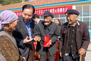 10月19日上午9:00,公司董事長趙曰嶺帶著267床高級太空被及30000元現(xiàn)金來到大王鎮(zhèn)幸福公寓進行慰問,受到了幸福公寓老人們的熱烈歡迎;10:00趙總又來到大王鎮(zhèn)西李村,向該村48位80歲以上的老人每人捐贈300元現(xiàn)金,同時,向全鎮(zhèn)所有80歲以上的老人每人捐款300元。在這次活動中我公司共計捐款68萬元,向社會奉獻了金嶺人的一片愛心,受到了社會各界的一致好評。