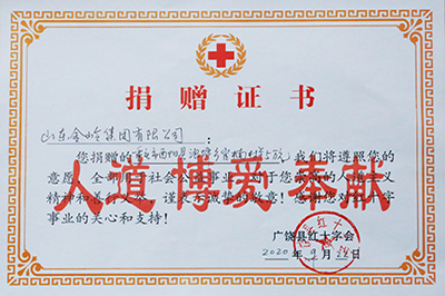 2020年9月24日,廣饒縣紅十字會(huì)頒發(fā)證書,對(duì)公司積極響應(yīng)市委、市政府號(hào)召,向重慶市酉陽(yáng)縣浪坪鄉(xiāng)官楠村捐款的行動(dòng)表示感謝。在捐贈(zèng)證書上,廣饒縣紅十字會(huì)表示:“您捐贈(zèng)的重慶市酉陽(yáng)縣浪坪鄉(xiāng)官楠村5萬(wàn)元,我們將遵照您的意愿,全部用于社會(huì)公益事業(yè)。對(duì)于您崇高的人道主義精神和善行義舉,謹(jǐn)表示誠(chéng)摯的敬意!感謝您對(duì)紅十字事業(yè)的關(guān)心和支持!”
