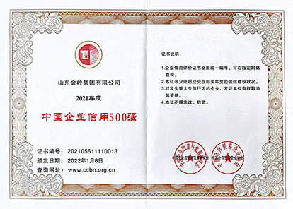 2022年1月8日,由中國企業(yè)改革與發(fā)展研究會、中國合作貿易企業(yè)協(xié)會聯(lián)合主辦的“2022中國企業(yè)信用發(fā)展論壇暨第十三屆誠信公益盛典”在北京召開,會議隆重發(fā)布2021年度“中國企業(yè)信用500強”、“中國民營企業(yè)信用100強”榜單,金嶺集團榮獲兩項榮譽,并在大會上受到表彰。作為《企業(yè)誠信管理體系》標準的起草單位,多年來公司高度重視企業(yè)誠信體系建設,堅持誠信經營,提升了全體員工的誠信意識,在社會上樹立了良好的企業(yè)信用形象。
