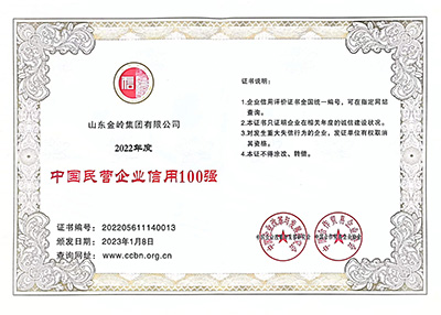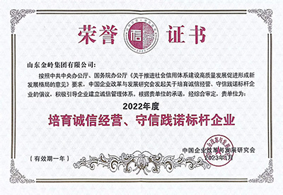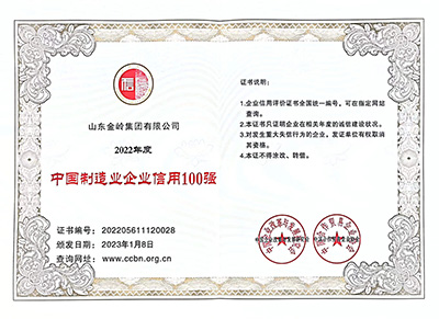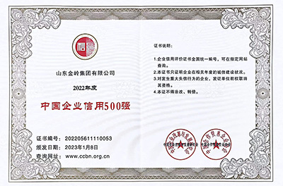 2023年1月8日,在中國企業(yè)改革與發(fā)展研究會、中國合作貿(mào)易企業(yè)協(xié)會主辦的“2023中國企業(yè)信用發(fā)展論壇暨第十四界誠信公益盛典”會議上,金嶺集團榮獲2022年度 “中國企業(yè)信用500強” 、“中國制造業(yè)企業(yè)信用100強”、“中國民營企業(yè)信用100強”、“培育誠信經(jīng)營、守信踐諾標(biāo)桿企業(yè)”榮譽稱號。多年來,公司始終高度重視企業(yè)誠信體系建設(shè)、加強合同履約考核,提升全體員工誠信意識,樹立了良好的企業(yè)信用形象。