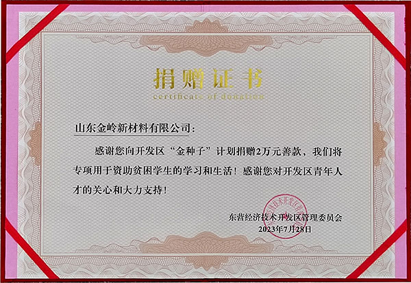 2023年7月28日,東營青年人才“背包E?!眴?dòng)儀式暨悅來湖人才街區(qū)開街活動(dòng)在開發(fā)區(qū)悅來湖人才街區(qū)舉行,山東金嶺新材料有限公司作為“金種子”贊助單位為活動(dòng)贊助資金兩萬元,東營經(jīng)濟(jì)技術(shù)開發(fā)區(qū)黨工委書記、管委會(huì)主任康茂禮為公司頒發(fā)榮譽(yù)證書,并對(duì)公司在開發(fā)區(qū)人力資源和社會(huì)保障方面做出的貢獻(xiàn)給予充分肯定。