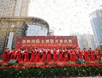 日,金嶺國際大酒店廣場彩旗招展,鑼鼓喧天,花團(tuán)錦簇,熱鬧非凡。